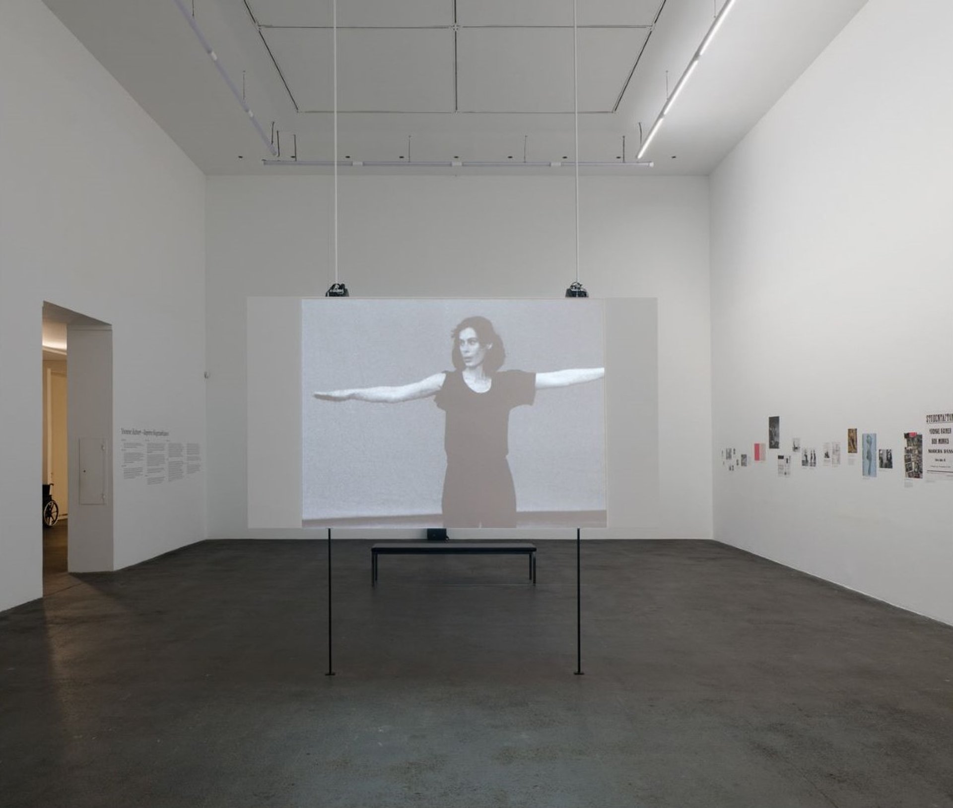 Vue de l’exposition « Yvonne Rainer. A Reader », Crac Occitanie, Sète, 2025. Au centre : Trio A, 1978, vidéo noir et blanc ; à droite : 48 documents (photographies, affiches, programmes) extraits des Yvonne Rainer Papers.