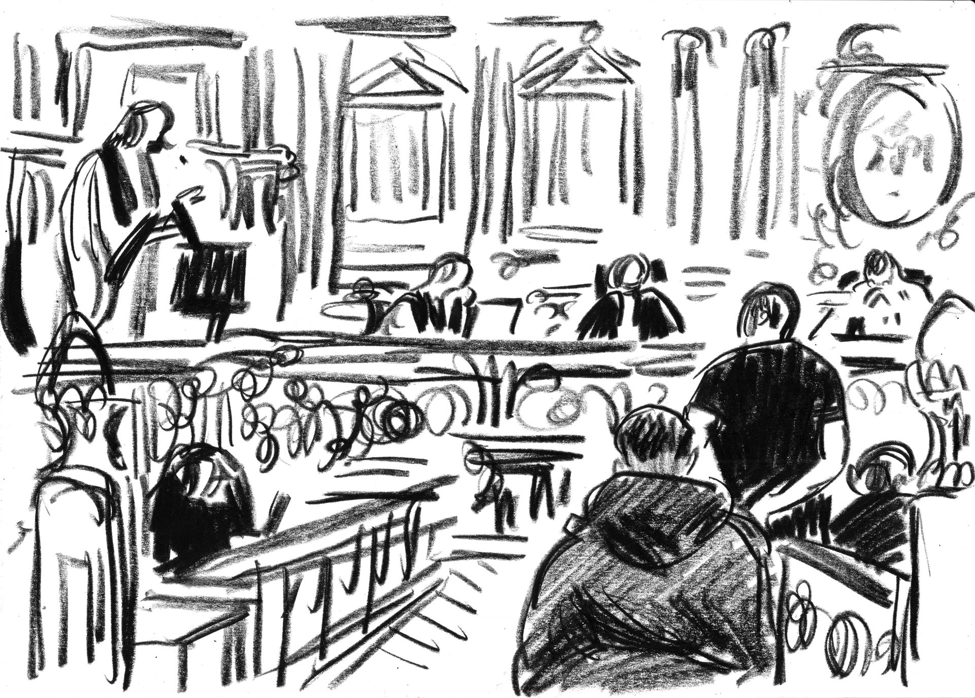 Hélène Le Cam, L’accusé à la barre interrogé par l’avocate générale, salle Voltaire, Cour d’Assise de Paris, Crayon semi-gras, 29,7 x 42 cm, 2026.