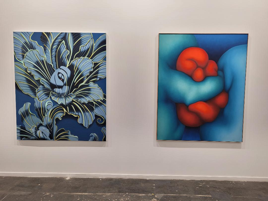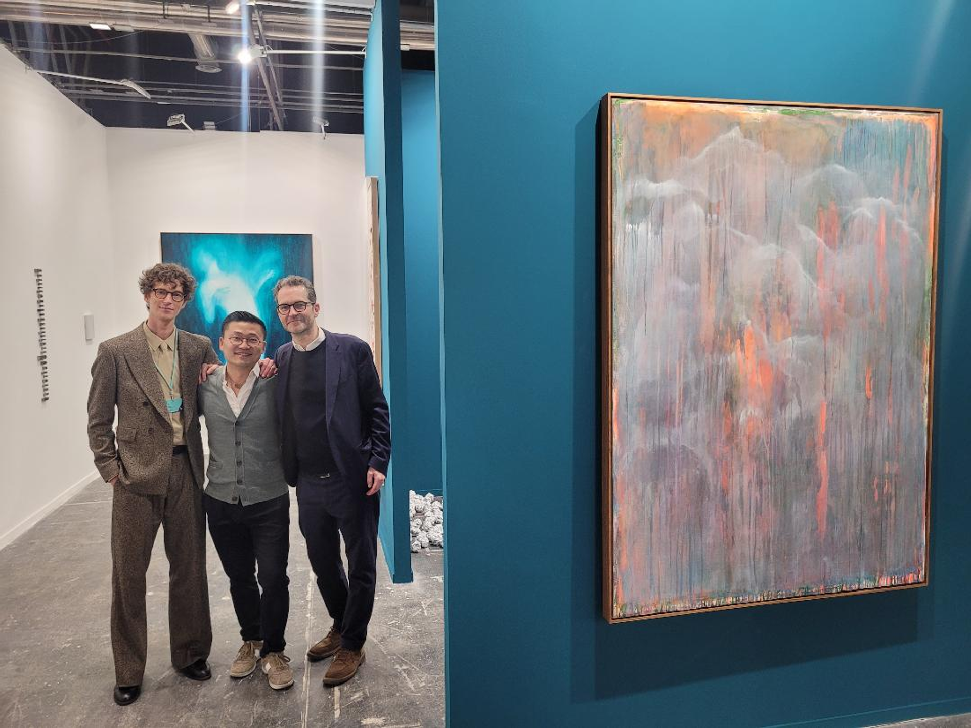 L'artiste Xie Lei, encadré du galeriste Olivier Meessen (à droite) et de Antoine Defeyt (galerie Meessen), devant une de ses peintures. A droite, tableau de Thu-Van Tran. ARCOmadrid 2026. Photo : A.C.