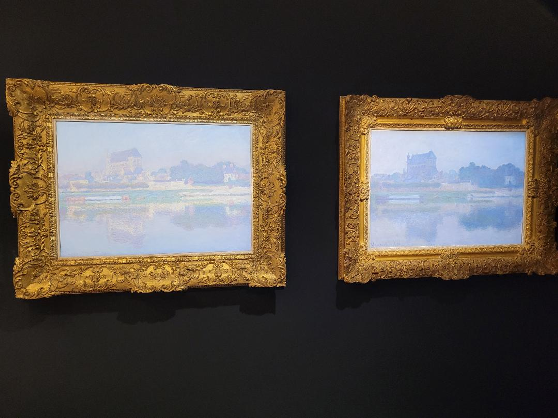 Deux tableaux de Monet représentant l’église de Vernon au pied de la Seine, chez Alon Zakaïm Fine Art. Photo : A.C.
