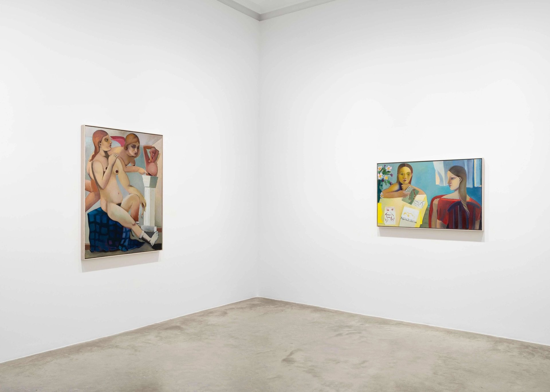 L’univers de Danielle Orchard est peuplé quasi exclusivement de femmes, et celles-ci sont le plus souvent nues. La stylisation apportée au corps, les libertés prises avec les postures et proportions renvoient au Picasso précubiste ou cubiste, tandis que les visages, très semblables, sont d’une facture néoclassique. Ceux-ci dégagent une forme de gravité qui peut être rêveuse ou mélancolique. Plus encore qu’à construire un dialogue avec quelques-uns des pères fondateurs de la modernité, Danielle Orchard semble vouloir donner vie à des nus de peinture, presque des abstractions, pour en faire des créatures ordinaires et contemporaines. Elle met en place une sorte de petit théâtre, en enfermant ses figures dans des intérieurs aux perspectives aplaties et en les portant le plus souvent aux limites de la toile. Lorsqu’elle peint six nus de face ou de dos, Orchard leur donne à tous la même taille, les aligne pour écarter toute visée décorative, et faire éprouver le lien de solidarité qui les unit. Par le choix du cadrage, par des détails et des déformations, Danielle Orchard sait donner à des scènes ordinaires un caractère d’étrangeté. Il y a en particulier un grand nu tête en bas, endormi, qui tient dans sa main en bouquet. Le collant translucide et la marque de sa couture apportent une touche de réalisme, tandis que les seins et le pli du bras dessinent un deuxième visage. L’artiste peut aussi produire des images allégoriques qui, dans leur fantaisie, ne sont pas sans évoquer l’inventivité poétique d’un Max Beckmann. Sa version de l’atelier d’artiste montre une femme nue enceinte qui, avec une lampe électrique, enferme son modèle sculptural dans un cône de lumière. De sa main droite, la peintre tient deux pinceaux croisés au milieu des pages ouvertes d’un cahier ; subtil équilibre entre la mise en scène et l’autobiographie.