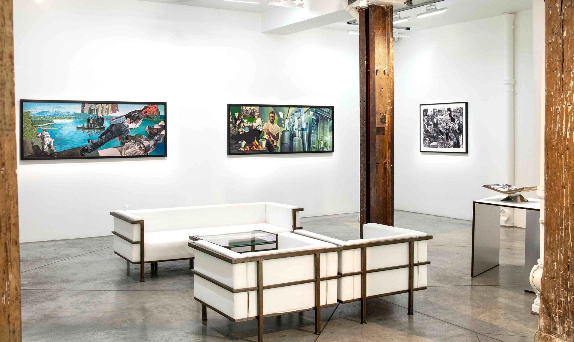 Avec une boîte à lettres américaine ouverte d’où dépassent des prospectus immobiliers et des sculptures africaines, et un flacon suspendu qui déverse au sol des centaines de gélules, Emmanuel Massillon donne le ton de « System structures ». Croisant stratégies conceptuelles, street art et esprit cartoonesque, Massillon aborde des sujets graves sans craindre de mêler ironie et empathie. Ce Washingtonien d’ascendance haïtienne est particulièrement bien situé pour observer la réalité sociale américaine. La présence dans l’exposition d’une porte défoncée dans un même élan par trois jambes – celle du militaire, celle du col-bleu et celle du col blanc – montre qu’il est difficile de s’abstraire de ladite réalité. Peints sur toile, les mots « birth » et « risk » font un juste diptyque, et dans un coin de la pièce, un raton laveur empaillé assure de sa protection une statue du Christ. En conclusion d’un parcours qui ressemble à un récit, s’offre à nous une scène d’explosion : un pupitre d’église suspendu à l’envers et vandalisé, d’où s’échappent les feuillets d’un sermon. Au sol sont répandus les effets personnels du pasteur disparu ou soufflé, ainsi que quelques billets de banque. Rien n’impose de donner un sens clair à ce qui peut très bien être une vision ou un rêve. On note que le sermon en est véritablement un, visant à convaincre de la dimension spirituelle du denier.