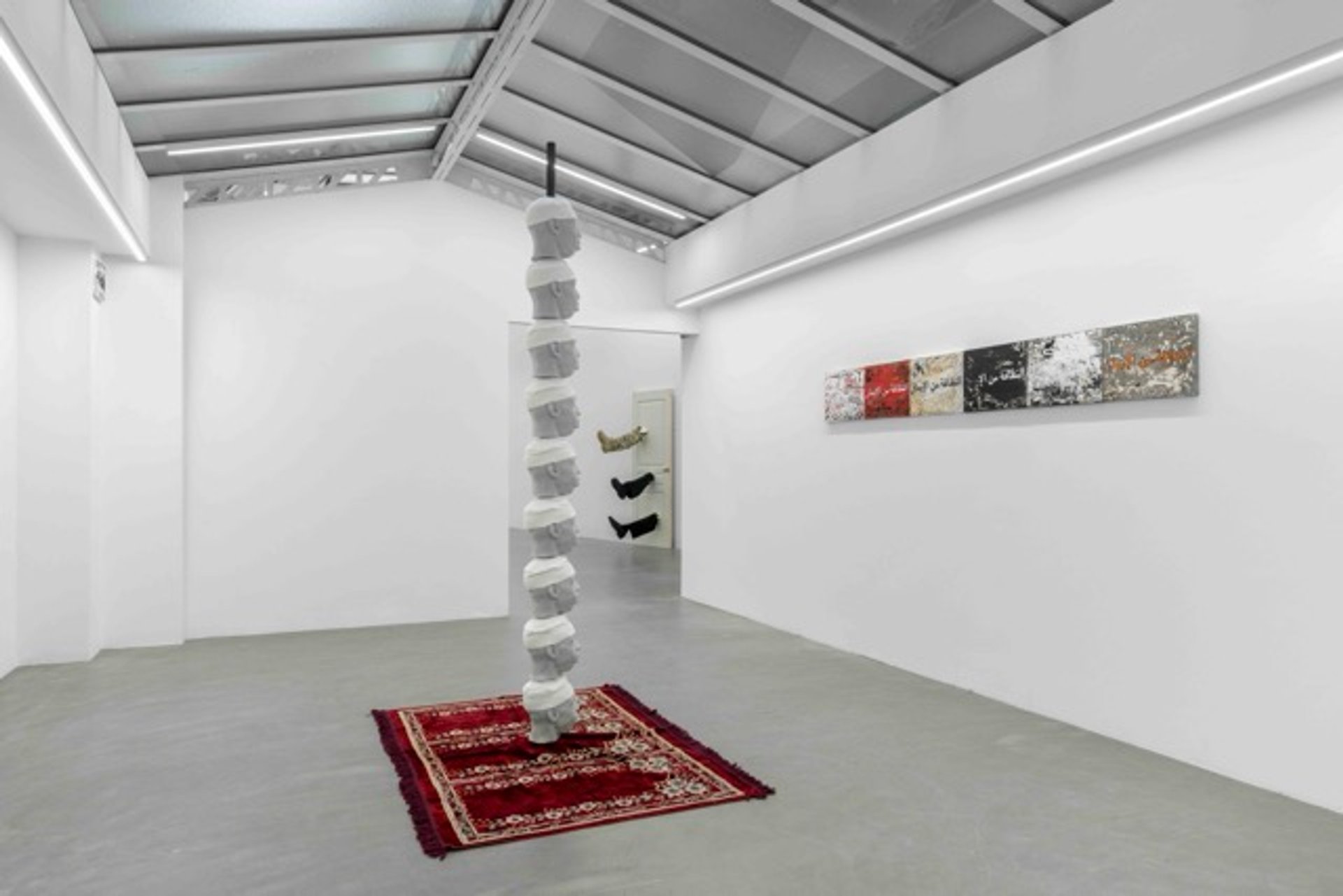 Comme pour contrebalancer ce coup porté au conditionnement religieux, l’exposition présente aussi une installation inspirée par l’univers carcéral et à l’importance de la conversion à l’Islam chez les noirs emprisonnés. Une colonne de neuf têtes semblables, coiffées d’une calotte africaine, se dresse au-dessus de trois tapis de prières réunis. Face à eux sont accrochés des tableaux peints avec un mélange de savon de prison, de cire d’abeille et de ciment. On y voit des phrases en arabe qui parlent de purification. Sur ce terrain de la religion comme force d’affranchissement, Massillon fait preuve d’une délicatesse certaine.