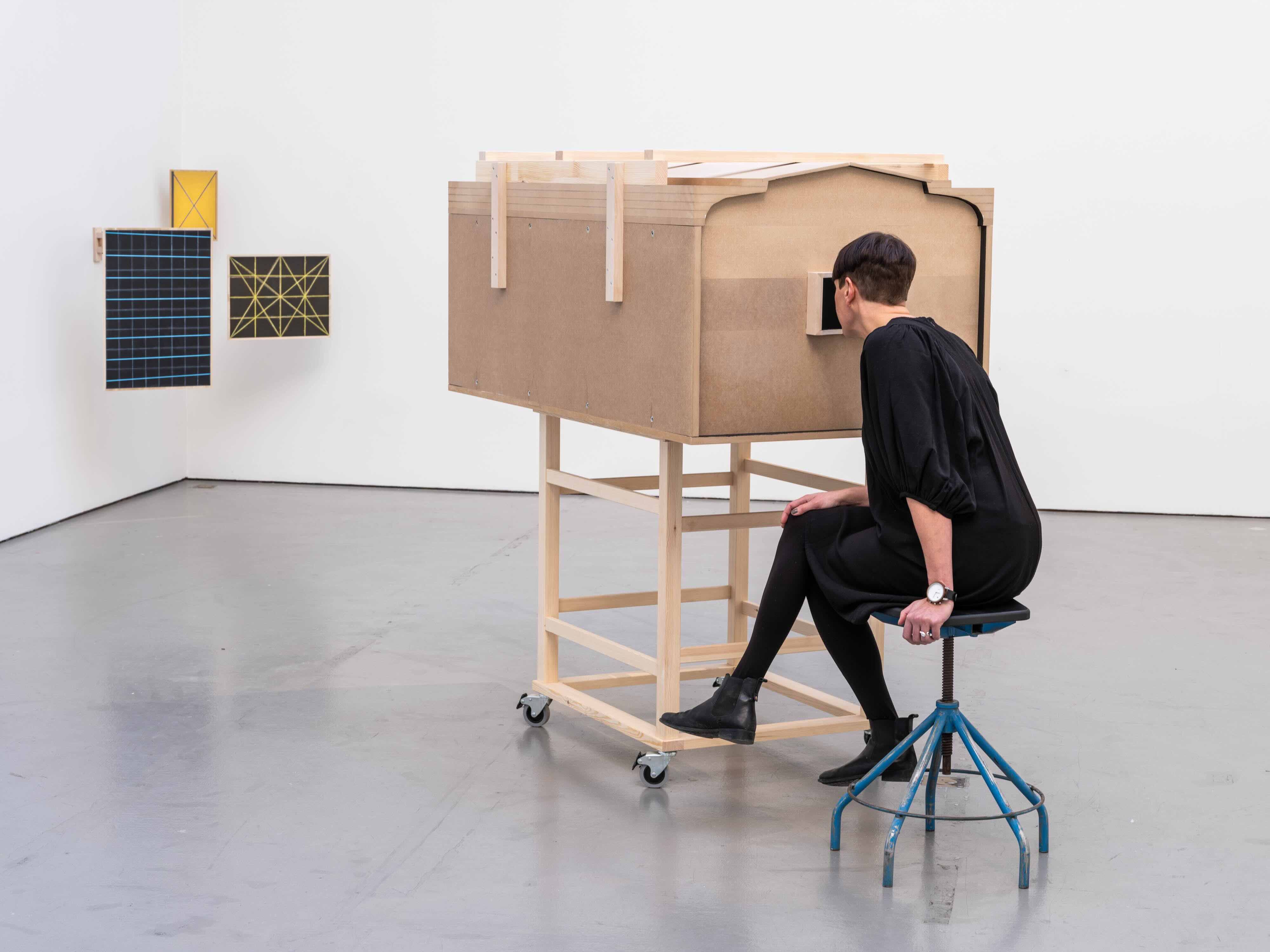 Matts Leiderstam travaille à la croisée de l’art et de l’investigation esthétique. Depuis longtemps fasciné par la façon dont la grille façonne notre univers visuel et notre rapport au monde, il peint ce motif sur des feuilles ou sur des panneaux de peuplier. Les grilles qui l’inspirent sont celles qui ont servi à la composition de grands tableaux de la peinture classique, ces schémas censés nous donner les secrets des chefs-d’œuvre pour reprendre un titre célèbre. Au cœur de « La grille et le regard » se trouve What Does the Grid Do, une longue boîte horizontale sur socle ouverte à chacune de ses extrémités. Le visiteur est invité à s’asseoir et à introduire sa tête dans l’une des extrémités pour observer à travers un couloir tapissé de noir les trois panneaux de peuplier fixés dans un angle du mur à l’autre bout de la pièce. À gauche, c’est un panneau vertical noir ou sur les lignes d’une grille blanche se superposent avec un léger décalage oblique des lignes horizontales bleutées. Cela ressemble à une trame de correction d’image numérique avant réglage. Le panneau qui se trouve à droite présente, lui, un quadrillage qui pourrait être la grille de lecture d’un tableau. Un panneau vertical jaune surmonte l’ensemble, divisé seulement par un X. La simplicité du schéma et la couleur semblent une allusion à l’icône. La machine à voir n’apporte pas de réponse à la question que pose son titre mais permet de concentrer son regard sur les éléments d’une théorie visuelle. Dans une autre salle, de petits panneaux ronds peints en cercles concentriques, et dispersés sur les murs, évoquent le rayonnement du soleil et de la lune. Ils sont mis en relation avec la reproduction d’un tableau de Claude Lorrain et de sa radiographie. Celle-ci fait apparaître que la place du soleil a changé au cours de son exécution. Une autre façon pour Leiderstam de nous projeter dans l’histoire de l’art.