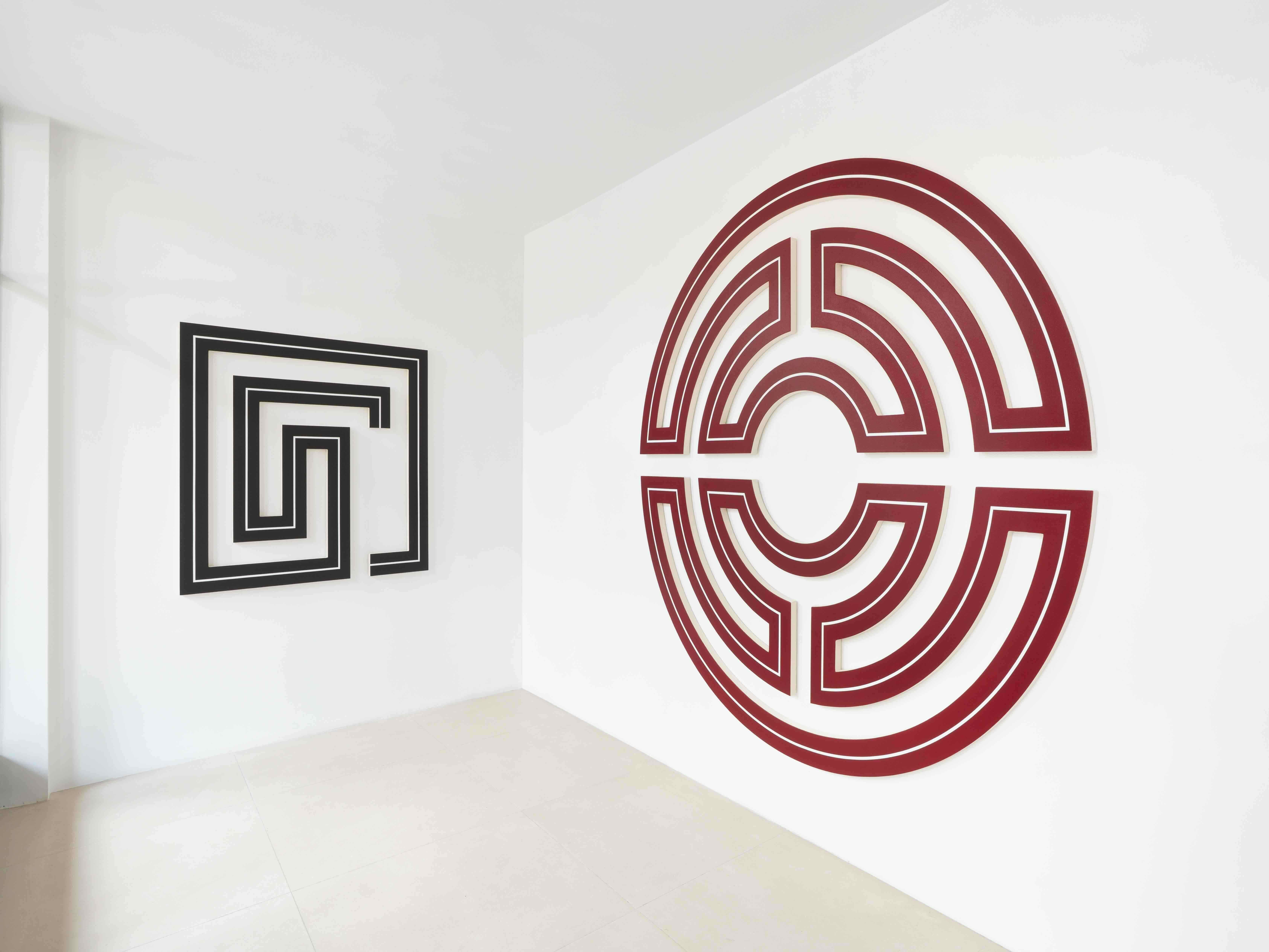 Dans le projet qu’il avait conçu dans le cadre de sa participation au Prix Marcel Duchamp 2022 au Centre Pompidou, à Paris, Philippe Decrauzat avait mis en évidence la complémentarité de ses shaped canvas et de ses films, et insisté sur l’importance de la relation à l’architecture pour celles-là. La présentation de trois shaped canvas sur les trois murs d’un espace plus contraint est l’occasion de repenser cette relation à l’architecture et de déplacer l’accent sur d’autres dimensions de ces œuvres. La peinture placée au centre du mur de face est un labyrinthe circulaire rouge en deux parties, avec une fine ligne blanche au milieu de la surface de toile, et ouvert en son milieu. Sur le côté gauche, c’est un labyrinthe rectangulaire noir avec ligne blanche dont les deux extrémités se rapprochent sans se rejoindre. Sur le mur de droite, la peinture rectangulaire noire avec ligne blanche ressemble à un agencement de vides : un carré central bordé sur tous ses côtés par deux bandes rectangulaires inégales. Dans chacun des cas, on peut y voir soit un plan au sol, soit une représentation de l’espace, le jeu du blanc avec le noir ou le rouge y ajoutant une vibration optique. Les peintures de Philippe Decrauzat sont aux shaped canvas historiques, ceux de Frank Stella en particulier, ce que l’anarchitecture de Gordon Matta-Clark est à l’architecture : une vision traversante. Vu de l’extérieur le shaped canvas rouge agit comme un puissant signal, fusion de l’oculus et du labyrinthe. Cette façon de faire entrer le spectateur dans le tableau, mentalement avec une très forte suggestion physique, n’exclut pas des rapprochements avec l’univers symbolique ou avec le cinéma. Dehors, la vitrine de la galerie produit un intéressant effet de cadre ; dedans, elle projette dans le jardin du Palais-Royal l’idée du labyrinthe.