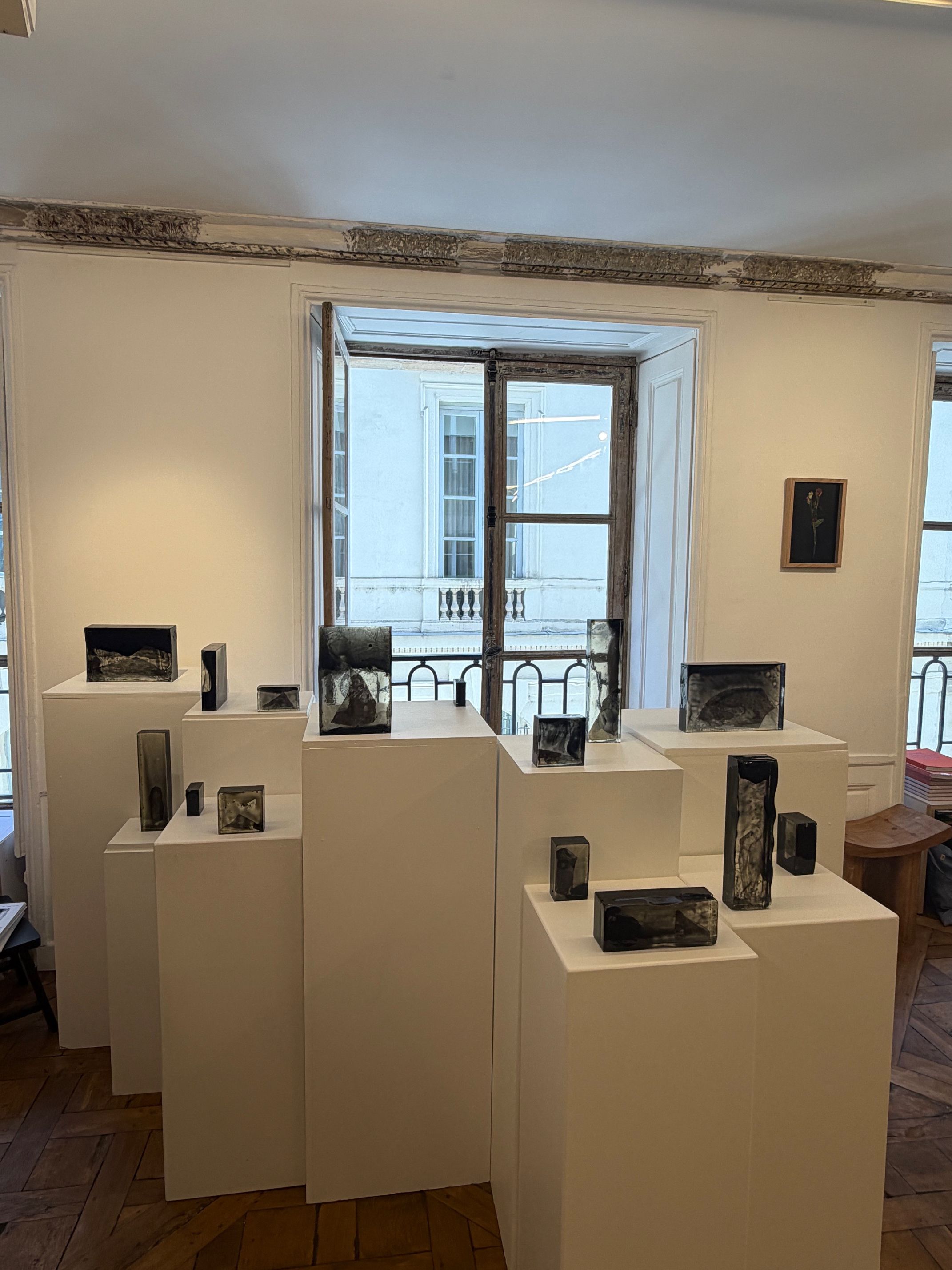 Dans la pièce suivante, Élie Monferier, avec son Journal des Mines, soit des impressions UV sur acier oxydé (autour de 8 000 euros), fouille la mémoire minière ariégeoise. Puis, Hélène Bellenger, portée par le Bureau Baillet, installe ses Carta Venere : des sculptures de carton imprimé, tiraillées entre la noblesse du marbre et la modestie du recyclage (de 850 à 1 450 euros). La lumière change dans la pièce qui donne sur la rue. Là, Claudia Huidobro déploie ses grands collages, fragments de magazines et livres vintage assemblés en partitions visuelles (de 5 800 à 6 500 euros). Selon Marie Darblay, de DartBLAY, son mécène, « les galeries peuvent faire leur marché ici ». Elle note de bonnes touches sur les grands formats.