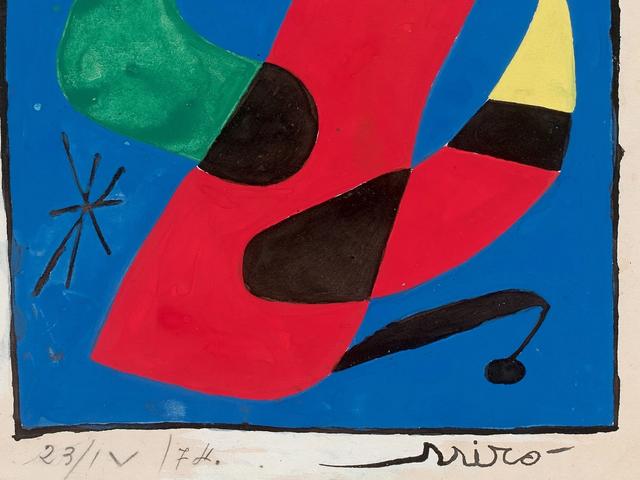 Outre un catalogue réunissant des toiles de Camille Corot, Auguste Renoir, Berthe Morisot, Bernard Buffet ou Antoniucci Volti, la société de ventes présente trois œuvres de Joan Miró, dont Oiseau bleu, propriété d’Hubert Germain, dernier Compagnon de la Libération.