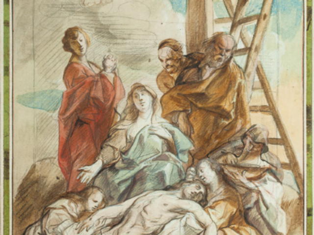 Cette aquarelle rehaussée à la gouache d’aspect tout à fait baroque est en réalité un dessin inédit exécuté par Jacob Jordaens vers 1650, préparant sa Déposition aujourd’hui conservée à la Kunsthalle de Hambourg.