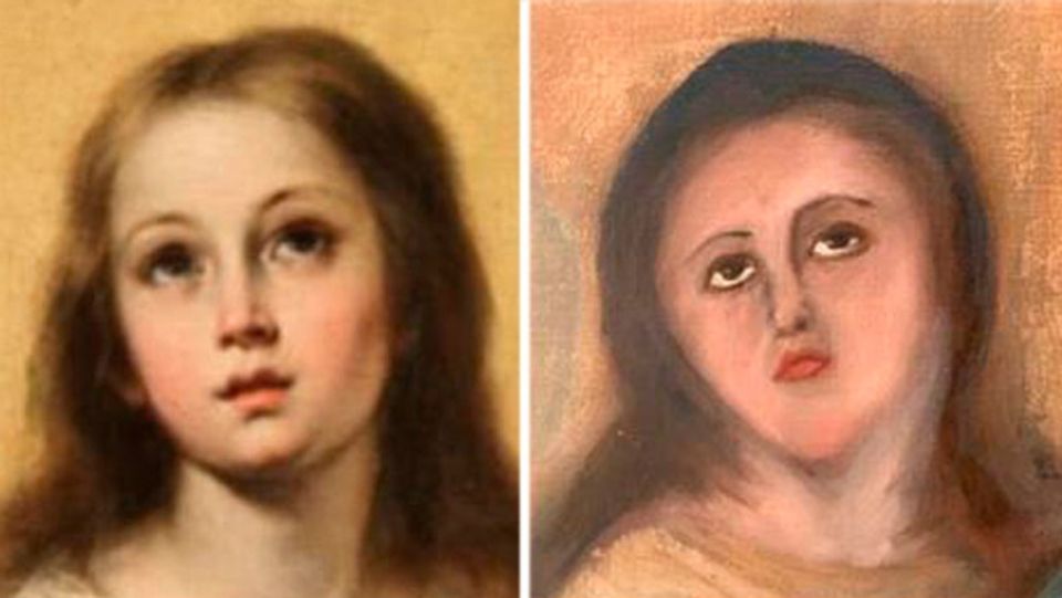 Confiée à un restaurateur de meubles, la restauration catastrophique d'une copie ancienne de l'Immaculée Conception de l’Escurial, de Murillo, fait polémique.