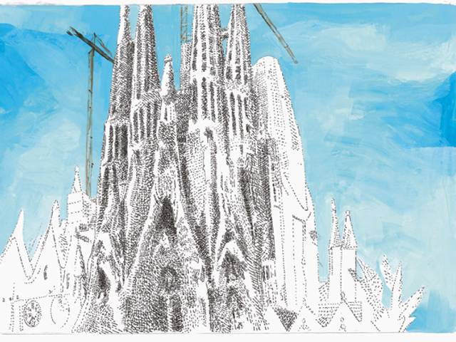 L’artiste revisite d’une touche légère les lieux phares de la fière capitale catalane, dont la fantomatique Sagrada Família.